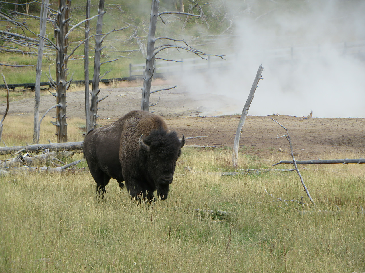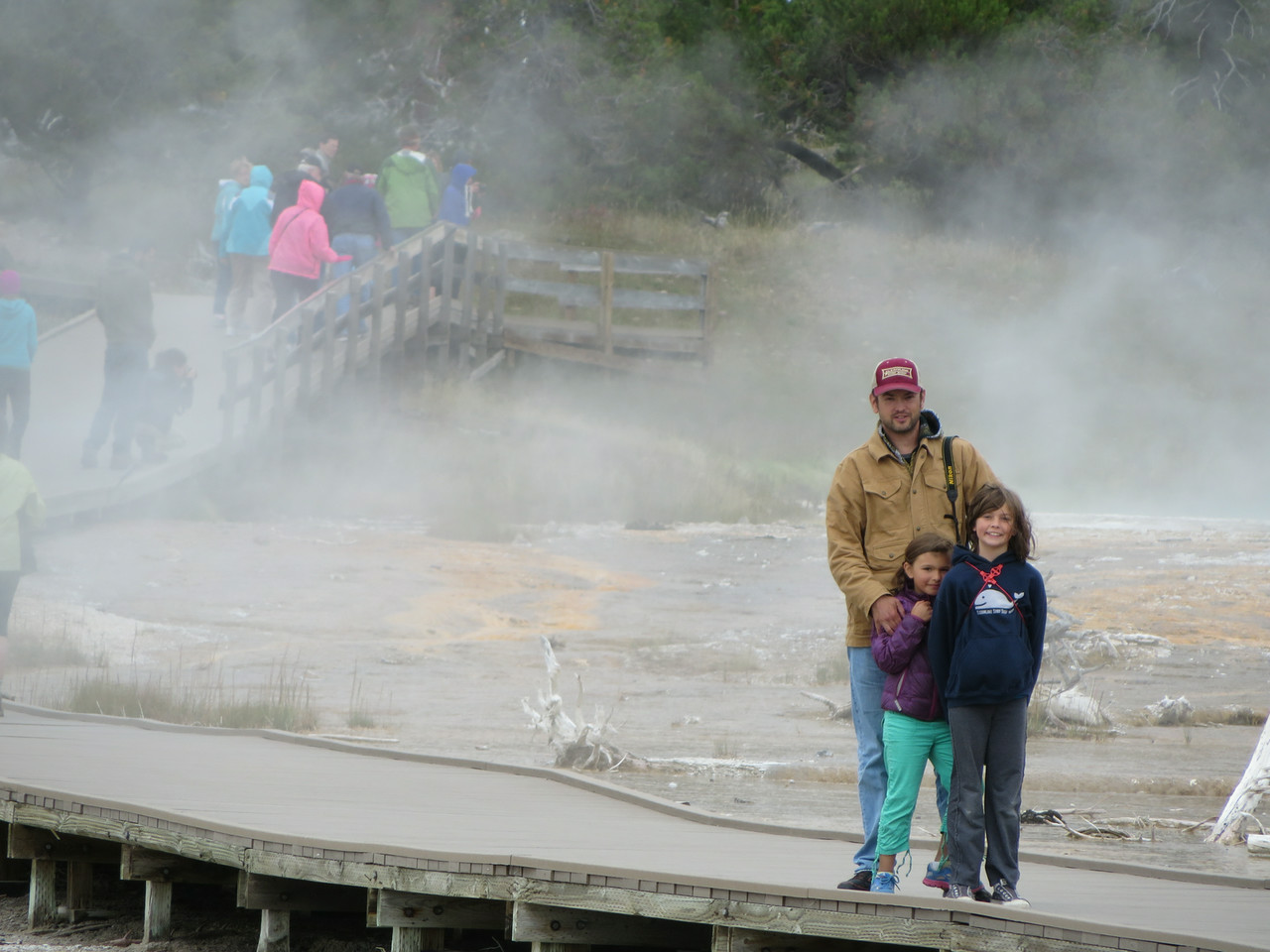 huge animal and it was moving very fast. Andrew was not pleased that our family was not all together when the bison was moving, but in my defense, I did not want to get in front of it, so I stayed put (but I may have been taking a few too many photos prior to the running of the bison). Another learning moment. From the bison experience we knew it is safest to stay together, so when we were crowded by tons of elk in Mammoth Hot Springs, we stayed together as a family and let the Park Rangers tell us where to go and how to stay out of their way. And we still got some great photos!