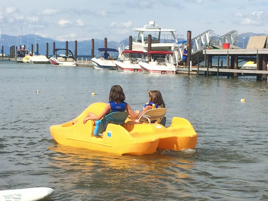 After 2 nights in Bend we were off to our next stop. We headed to South Lake Tahoe to a place called Camp Richardson, on the California side of the Lake Tahoe. One thing we did realize on this trip is that driving time in the camper is a lot different than driving times provided by Google Maps. We found out that when Google says it will take 7 hours to get somewhere it will really take us about 9-10 hours, as the trip went on we made the adjustments and determined that on our next long road trip driving times will be much shorter and staying times will be longer. When we finally got into Camp Richardson after about 9 hours on the road, we were greeted by a huge thunderstorm (which made getting the paddle board on the roof a little tricky), but we couldn’t let it keep us in, we needed dinner so we set off in our ponchos to the restaurant and had dinner in the historic Beacon Bar & Grill. The next day the sun came out, in the morning we rode our bikes into town to get groceries for dinner and in the afternoon we were able to play on the water. Andrew and the girls rented a jet ski, while I paddled around the lake.  We enjoyed dinner at the campsite that night and the girls made friends with the other kids on their bikes. It was a great sight watching the kids bike around with other girls from Nevada & California, they had fun checking out other kids campers, making plans to meet up and exchanging addresses to be pen pals. One great thing about being away from home for awhile is that the kids learn to break out of their comfort zone and explore new things and meet new people.