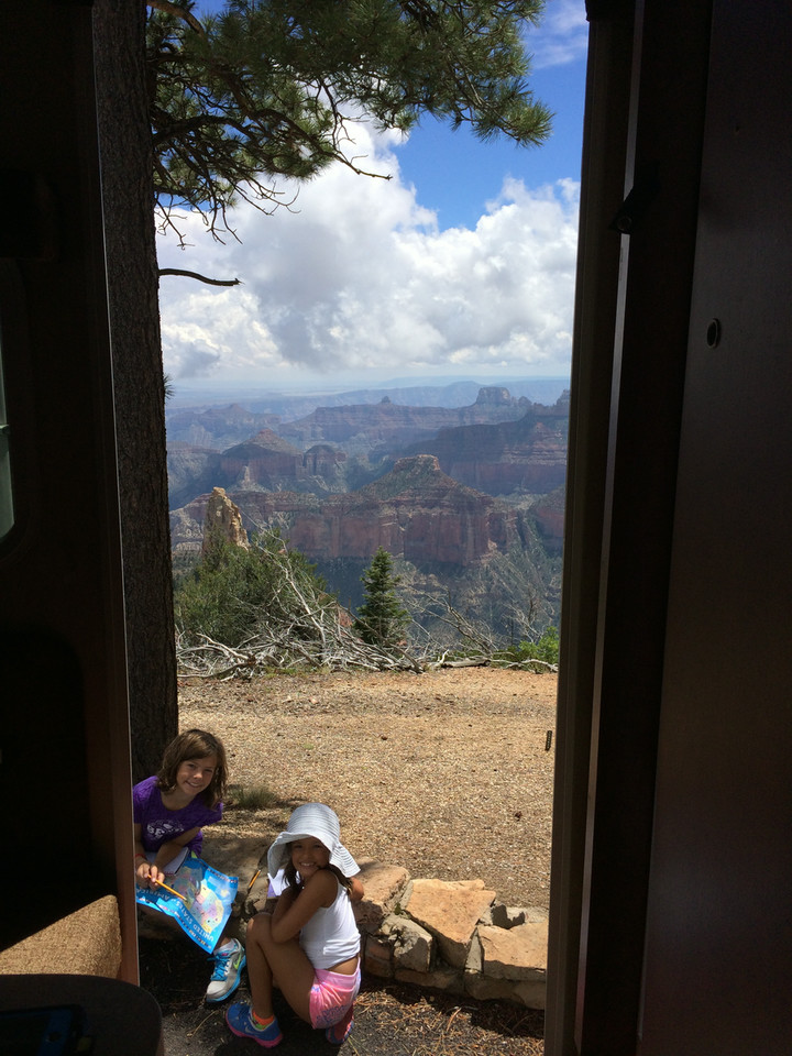 We spent 2 nights at Lake Tahoe and then we were off to the Grand Canyon, another super long drive — seeing a trend yet? After this long trip, we learned no more driving at night. Setting up at night, even in a camper is tricky, but we made it to the North Rim without hitting any wildlife (thank God and super driver Andrew!) and rested up for a great day at the Canyon. In the morning we got up and headed to Point Imperial, the highest point on the North Rim at 8,803 feet (2,683 meters), overlooking the Painted Desert and the eastern end of Grand Canyon. We hiked one of the rim trails for a couple hours and then had lunch in the camper, overlooking the Canyon. For me, this was one of the highlights of the trip and one of the things I love about having our camper. Being able to have all your stuff right there is so convenient and made lunch a great experience. After lunch we explored the North Rim lodge and listened to some great Ranger Talks. The next day we took a tougher hike down into the canyon. We started at the North Kaibab Trail, headed down past the Supai Tunnel into the Roaring Springs Canyon. We turned around at the bridge that was recently built and headed back up, overall we hiked about 6.5 miles – we were super proud of the girls. It took about 2 hours to get down and only 2 hours and 15 minutes to get back up. They were super hikers! After the long day of hiking we had lunch at the North Rim Lodge and then decided to get on the road so that we could break up our 10 hour drive to the cabin in New Mexico into two days of driving – instead of one long day…see we’re learning! We did a little cheat here and ended up in a hotel in Farmington, NM. We were going to find a place to camp but with the camper packed with the paddle board, bikes, a bbq and much more, we couldn’t really boondock it with all our gear. We enjoyed clean sheets, fresh showers and a free breakfast! And were able to get on the road early and were able to see family in Eagle Nest in the early afternoon.